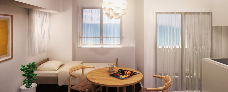 「ラクレイス薬院」は、SOHO、1ROOM、1LDKの全59戸。上層階は、西日を避けた東向きの住戸配置とすることで、居住者の快適性を高めるとともに、熱負荷の低減を図っています。