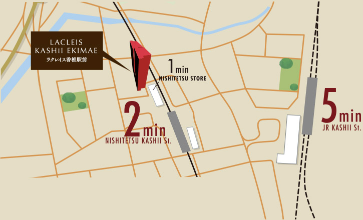 西鉄香椎駅まで徒歩2分、JR香椎駅まで徒歩5分。