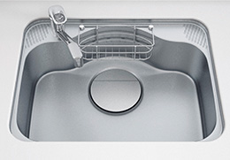 77cm×49cm幅で大きな鍋も洗える奥行きワイドなサイズ。ゆったりとして使い勝手のいいシンクです。低騒音仕様でシンクにあたる水ハネ音を低減しました。