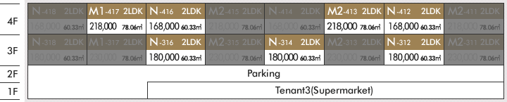 | 共益費 | 1R、1LDK、2K、3K/8,000円(月額) 2LDK/15,000円 ※M1、M2タイプは20,000円(月額) 3LDK/20,000円(月額) |